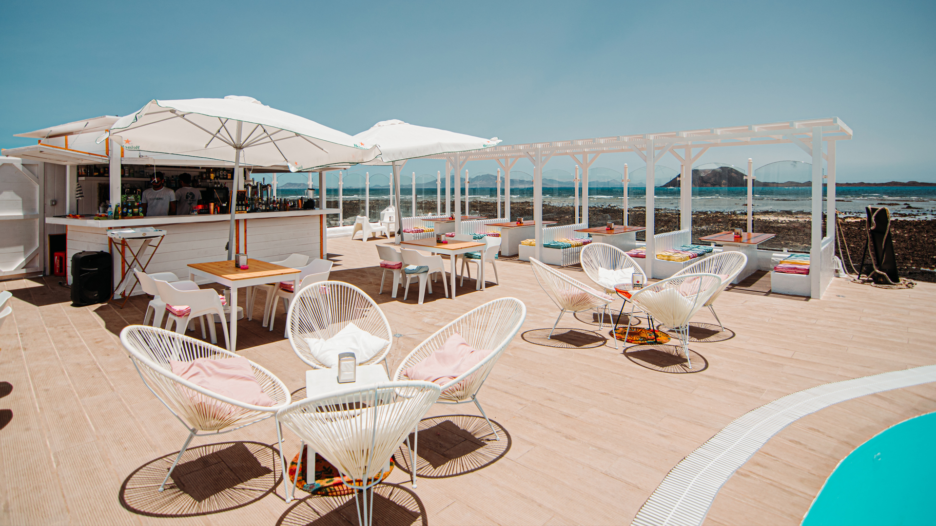 Nuestros apartamentos en Corralejo ofrecen piscina, bar en la piscina y restaurante a la carta, ideales para relajarte después de un día de surf.